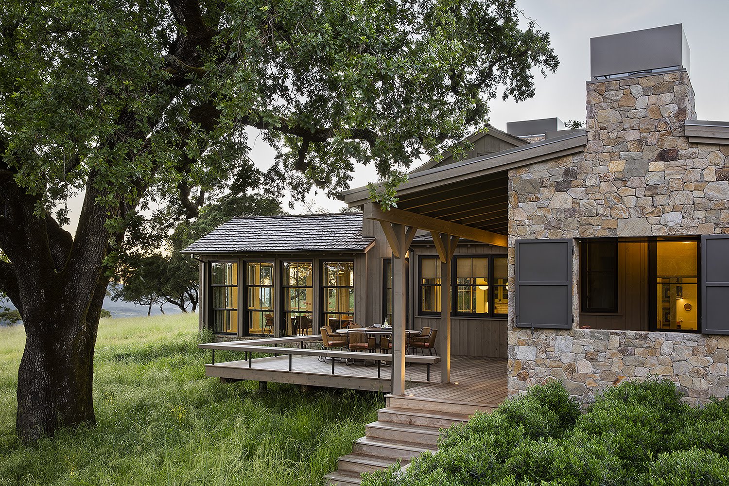 A shared vision with the client was hatched for an elegant, yet straightforward home design based on respect for the land, reinforcing the natural spaces rather than competing. A study of ranch houses and lodges revealed elements for success – long covered porches, a sheltered yet open courtyard, natural stone, stained cedar and decks that embraced shade from the majestic oaks with landscape and structures to maintain the natural surroundings as the main focus of the project.