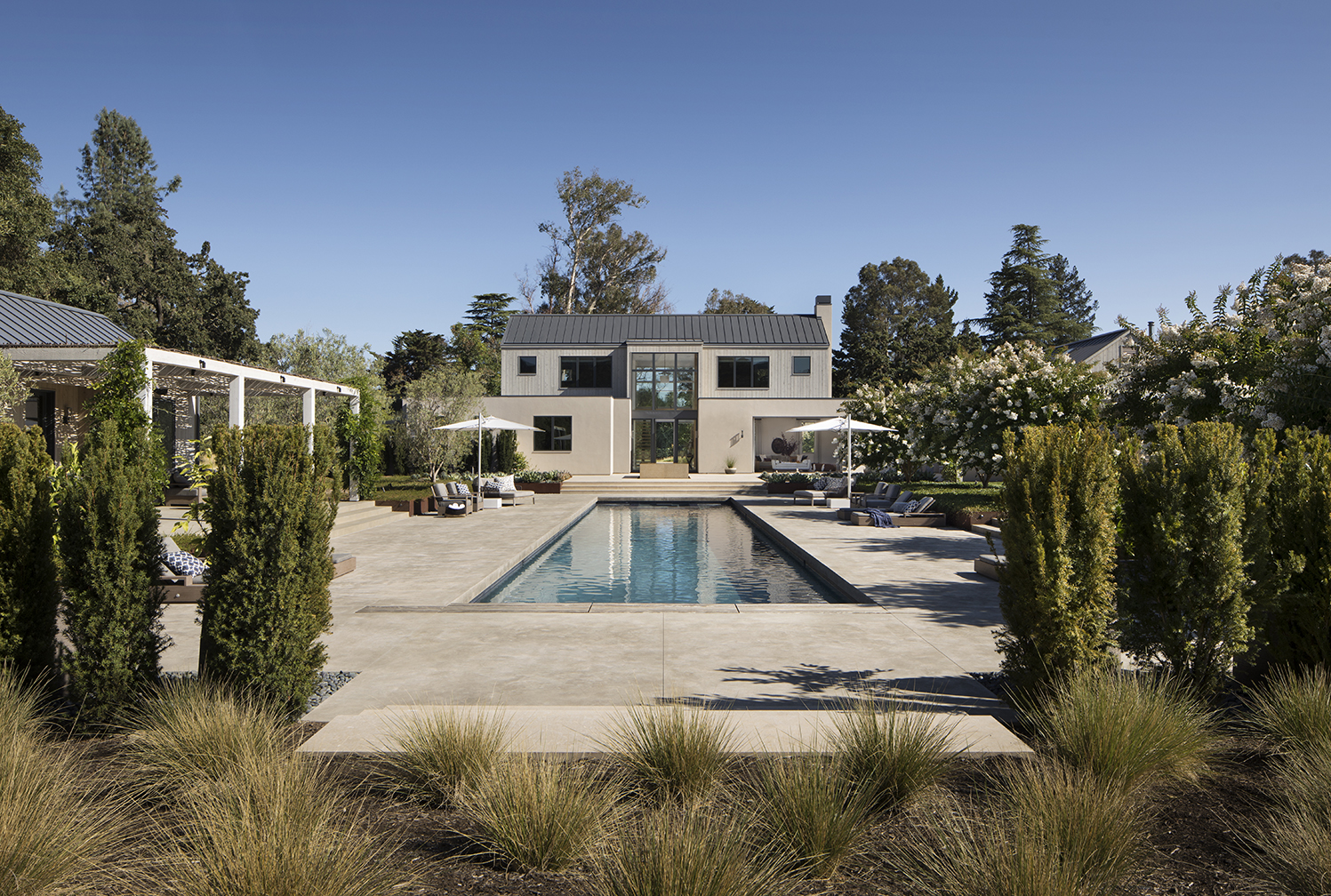 Set on 3 acres in the heart of Sonoma wine country, this contemporary yet cozy compound was created for weekend getaways and entertaining. The estate includes a main residence, pool house and covered outdoor entertaining space equipped with a kitchen and pizza oven. The large, rectangular pool serves as the strong axis point to all. A few of its many unique attributes include the front façade, which features a cantilevered upper story clad in wood with gabled roof meant to perch over the ground level, with its cleaner contemporary geometries. The statement entry space is additionally memorable with its glass and steel railing and transparent wall to usher in views of Mt. Veeder and beyond.